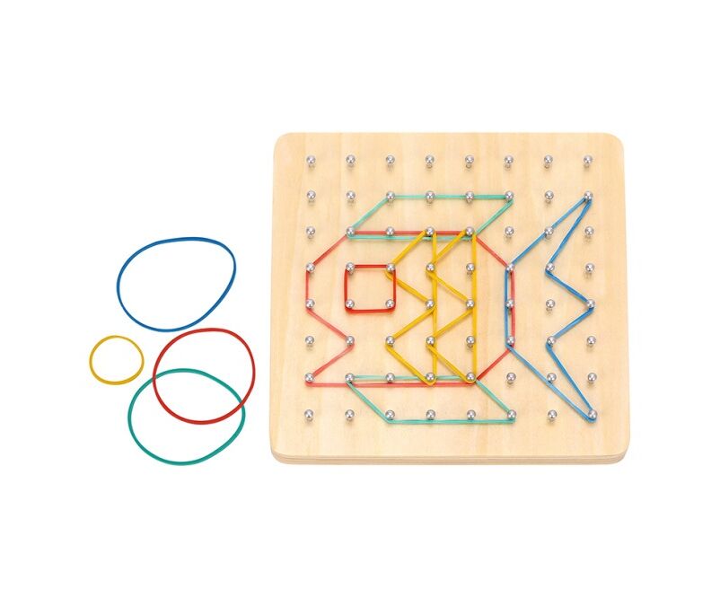 Геоборд с резинками, или математический планшет — это деревянная развивающая игрушка в виде доски со штырьками, между которыми натягиваются резиночки. Игра создана для раннего развития детей по методике Монтессори.